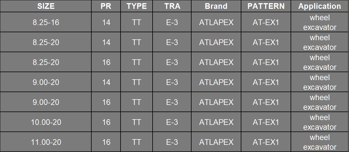 Wheeled excavators are the workhorses of construction, industrial, and urban job sites—blending mobility with precision digging power, they operate across mixed surfaces, endure frequent turning, and bear variable loads every day. To keep these critical machines running at peak efficiency, you need a tire engineered specifically for their unique demands. ATLAPEX delivers exactly that with the E-3 AT-EX1 Pattern Wheel Excavator Tire—available in four high-performance sizes — 8.25-16, 8.25-20, 9.00-20, 10.00-20, and 11.00-20, where a precision-crafted tread pattern takes center stage, paired with premium materials to redefine durability, traction, and stability for wheeled excavators and other heavy-duty equipment.