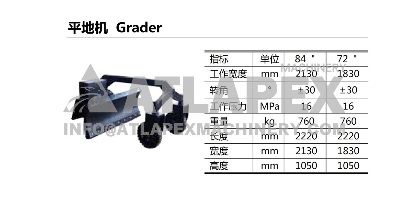 When equipped with the grader, it becomes a capable lightweight bulldozer that can be used for site leveling operations. The ATLAPEX grader attachment is a hydraulic-controlled plow blade that comes in two sizes, 183cm and 213cm, with hydraulic-electric control devices that allow for six-way adjustment.